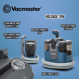 Accessoires fournis : 1 batterie 24V – 4Ah, un chargeur (3H), 1 brosse pour tâches tenaces (nettoyage de tapis, moquettes, tapisseries et surface difficiles d’accès) et un flexible 1.8M.