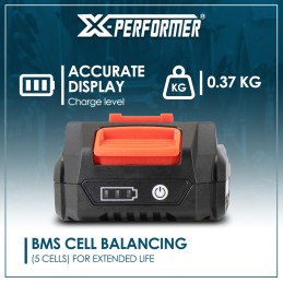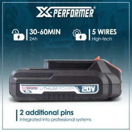 Cette batterie lithium 20V s'adapte sur tous les outils de la gamme X-Performer nouvelle génération (ne convient pas pour la gamme X-Performer blanche) et est compatible avec les chargeurs XPCHAR20-SR1, XPCHAR20-SSR3, XPCHAR20-SSR4, XPCHAR20-DR1 ou XPCHAR20-DSR2).