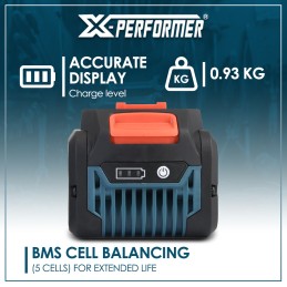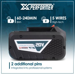 Cette batterie lithium 20V s’adapte sur tous les outils de la gamme X-Performer nouvelle génération (ne convient pas pour la gamme X-Performer blanche) et est compatible avec les chargeurs XPCHAR20-SR1, XPCHAR20-SSR3, XPCHAR20-SSR4, XPCHAR20-DR1 ou XPCHAR20-DSR2).