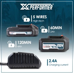 Ce chargeur vous permet de charger les batteries X-Performer nouvelle génération XPBAT20-2A, XPBAT20-4A, XPBAT20-6A et XPBAT20-8A (ne convient pas pour les anciennes générations XPBAT2A et XPBAT4A).