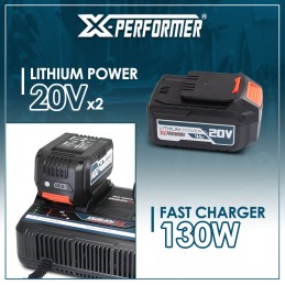 Il est composé de 2 batteries 20V – 4Ah et d’un chargeur double rapide.