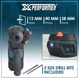Léger et compact, ce marteau perforateur est très ergonomique. Pour un confort de travail absolu, il possède une poignée soft grip ainsi qu’une lampe LED qui éclaire la zone de travail, de plus il est livré avec 2 mèches SDS (10 – 12mm).