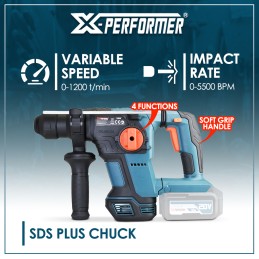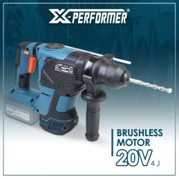 Le puissant marteau perforateur rechargeable XPRH4BL est idéal pour tous les travaux de perforation et de burinage. Avec 5500 coups par minute et une vitesse variable de 0-1200 tours par minute, il est capable de travailler différents matériaux tels que l’acier (13 mm), le bois (40 mm) et la pierre (28 mm). Le mandrin SDS+ permet le changement rapide du burin ou du forêt.