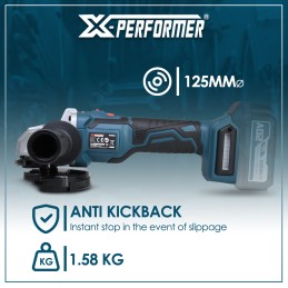Pour plus de sécurité, cette meuleuse est équipée d’un démarrage progressif et du système anti kickback, si votre disque se bloque brusquement dans le matériau travaillé, la meuleuse se coupe automatiquement