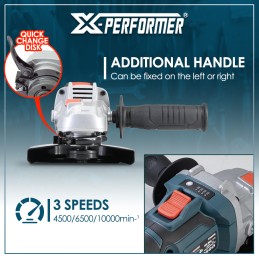 La meuleuse d’angle sans fil XPAG125BL est parfaite pour le meulage, l’ébarbage ou le découpage. Maniable et ergonomique, elle vous offre un grand confort d’utilisation quel que soit l’angle de travail. Grâce à une puissance de 20V, une vitesse de rotation variable de 0-9000 tours par minute et un moteur brushless apportant une puissance plus élevée et une durée de vie plus longue cette meuleuse d’angle répondra à toutes vos exigences, même les plus élevées. Elle possède un système de blocage de l’axe pour un changement de meule simple et sécurisé.