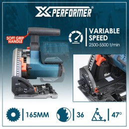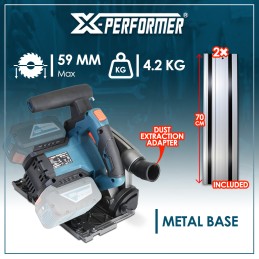 La scie circulaire plongeante sans fil XPPS165BL vous permettra de faire des coupes précises grâce au système de guidage ( 2 rails en aluminium de 70cm chacun) et au système de plongée progressive.