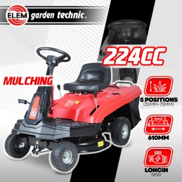 Cette tondeuse rider à démarrage électrique 61 cm de la marque Elem Garden Technic est équipée d’un moteur Loncin 224 cc - 5 KW. Elle est idéale pour la tonte de grande surface. Elle possède un système de réglage centralisé qui permet de modifier facilement la hauteur de coupe selon vos besoins (5 positions entre 35 et 75 mm).